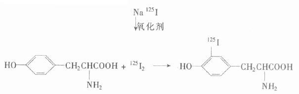 多肽激素与蛋白质多用碘标记,最常用的是125I。碘化反应的基本过程如下:通过氧化剂的作用,使碘化物(125I-)氧化成的碘分子(125I2),再与多肽激素、蛋白质分子中的酪氨酸残基发生碘化作用。所以不管采用哪一种放射性碘标记法,标记的化合物内部必须有碘原子可结合的基团,即结构上要含有酪胺基或组织胺残基。凡蛋白质、肽类等抗原,在结构上含有上述基团的可直接用放射性碘进行标记。如不含上述基团的,放射性碘无法标记,必须在这些化合物的结构上连接上述基团后才能进行碘标记。