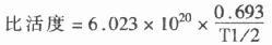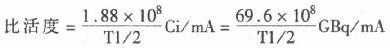 (2)比活度的理论值计算:每种放射性核素有一个比活度理论值,取决于该核素的半衰期和衰变常数。若N是1毫克原子(1mA)的总原子数,衰变常数λ(单位时间衰变的%),则