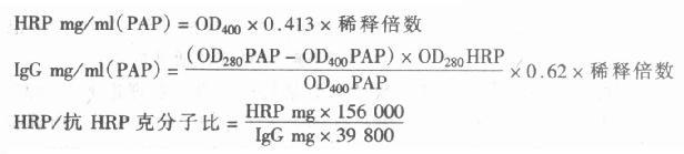 制备的PAP复合物应检测酶和抗体的含量,以鉴定PAP复合物的质量。常用分光光度计检测PAP的复合物在280nm(IgG的最大吸收波长)和400nm(HRP的最大吸收波长)的光密度值(OD值),按下式计算IgG和HRP的含量: