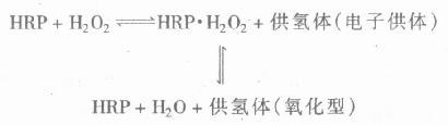 HRP特异底物为H2O2,在分解H2O2过程中,与H2O2形成复合物,无电子供体存在时,反应不再进行,当电子供体存在时,迅速生成水,酶被还原,电子供体被氧化环化,形成苯乙胼聚合体(图4-2)。在酶反应部位,形成不溶性棕褐色沉淀,与组织对比清晰。