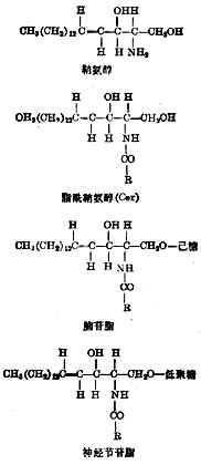 ⑦糖脂糖脂的基本结构是鞘氨醇(图4-10),它的氨基与脂肪酸(含14~16个碳原子)酰化后得脂酰鞘氨醇,符号为Cer。再与葡萄糖或半乳糖相连成脑苷脂。和低聚糖(由几个或多至30多个单糖或其衍生物组成)相连后成神经节苷脂。已确定结构式的有数十种,区别在于糖链和脂肪酸的不同。