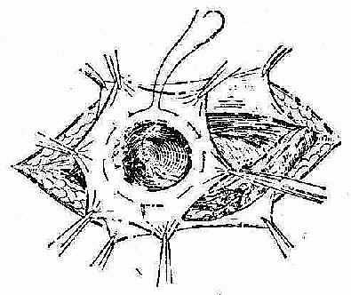 直疝多采用手术疗法。手术要点:加强腹内斜肌和腹横筋膜的抵抗力,以巩固腹股沟管的后壁。直疝修补方法,基本上与斜疝相似(图2-28、29)。常用 Bassini法,如果在手术过程中,发现腹横筋膜缺损很大,不能直接缝合时,可利用自身阔筋膜、腹直肌前鞘,以及尼龙布等材料,作填充缺损成形术。